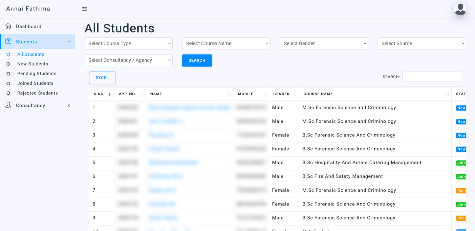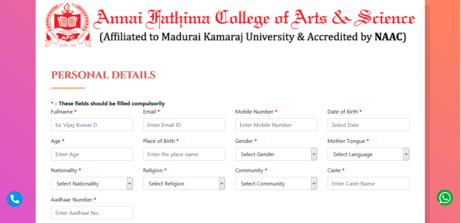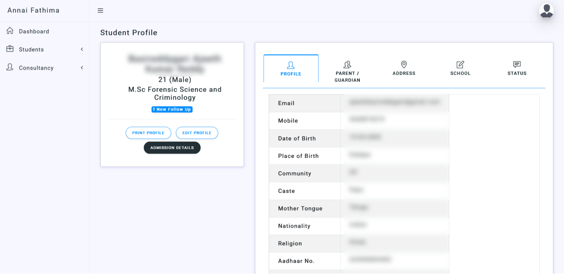 Annai Fathima College Application is a robust web-based platform designed to facilitate the admission process for prospective students interested in pursuing various courses offered by the institution. Through this application, students have the opportunity to submit their admission forms by furnishing all essential information. Meanwhile, the administrative personnel possess the capability to efficiently oversee and monitor the application submissions, as well as update the corresponding application statuses. Furthermore, this application incorporates stringent security measures, including robust validation protocols, to effectively prevent spam inquiries and ensure data integrity.