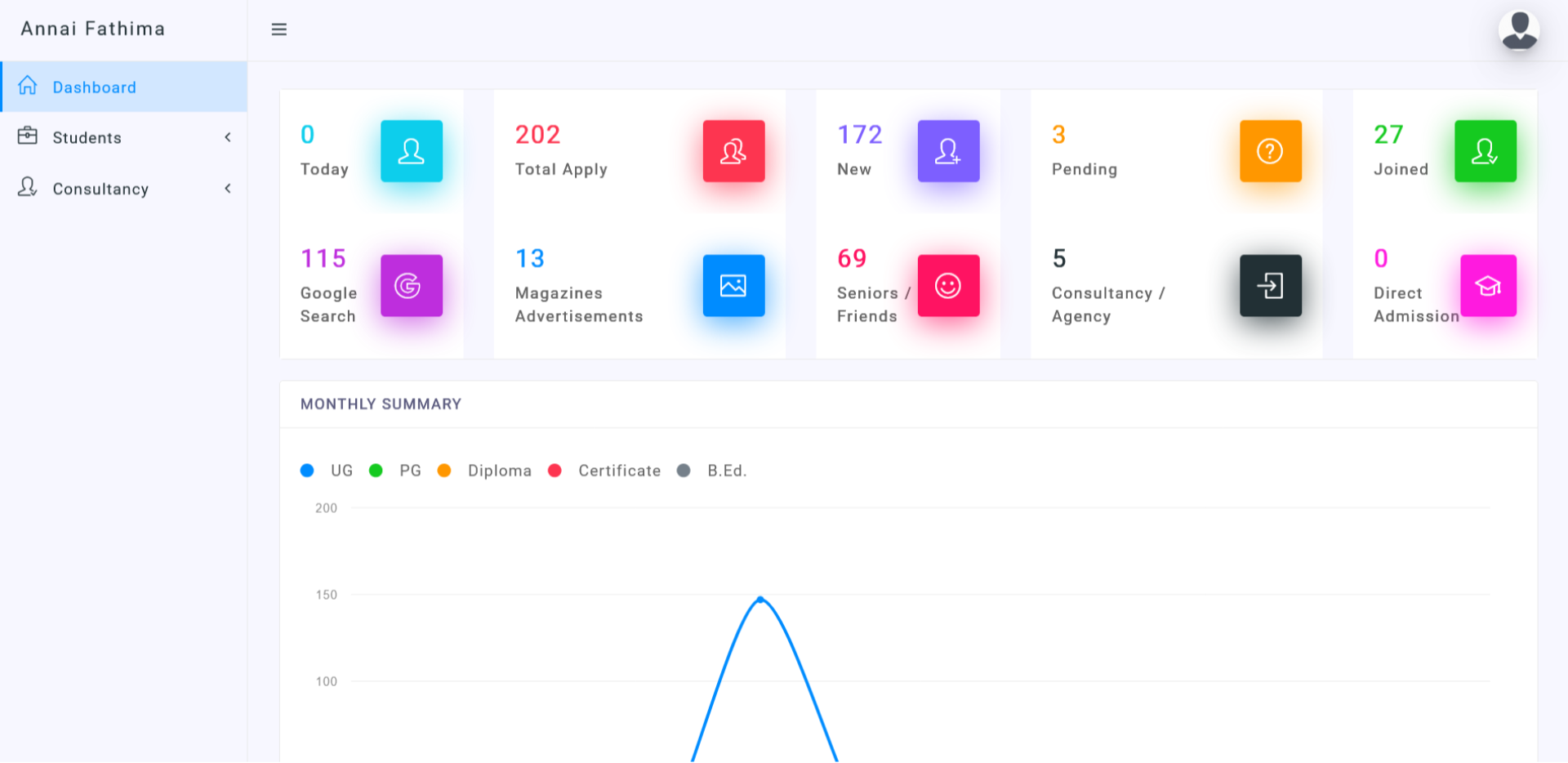 - Powered by dashboard that symbolizes the summary of students with count, graph, pie chart.
